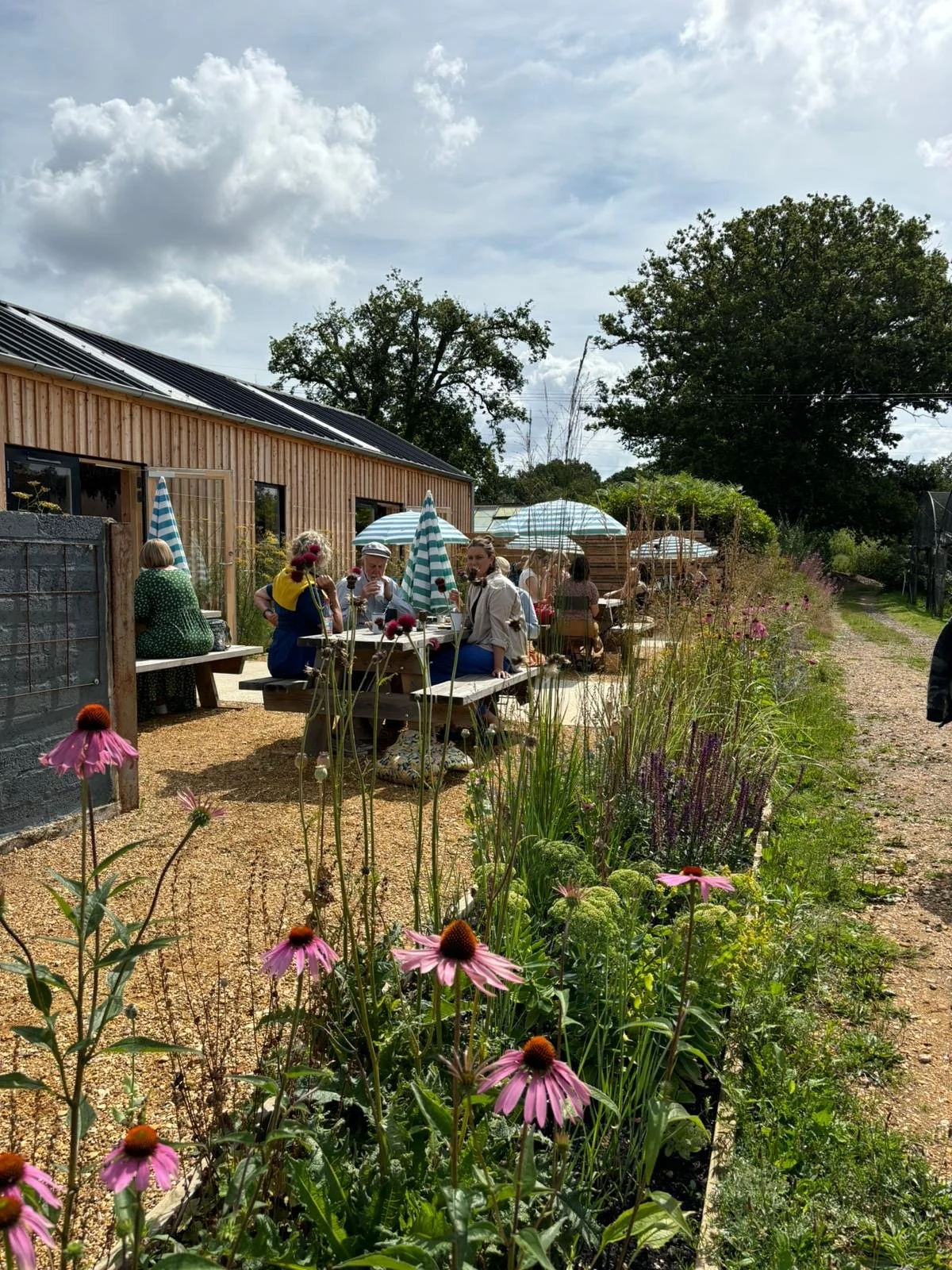 The flower barn cafe & courtyard is next to the car park and the flower field itself is a 100 yards on from there up a compacted gravel track.